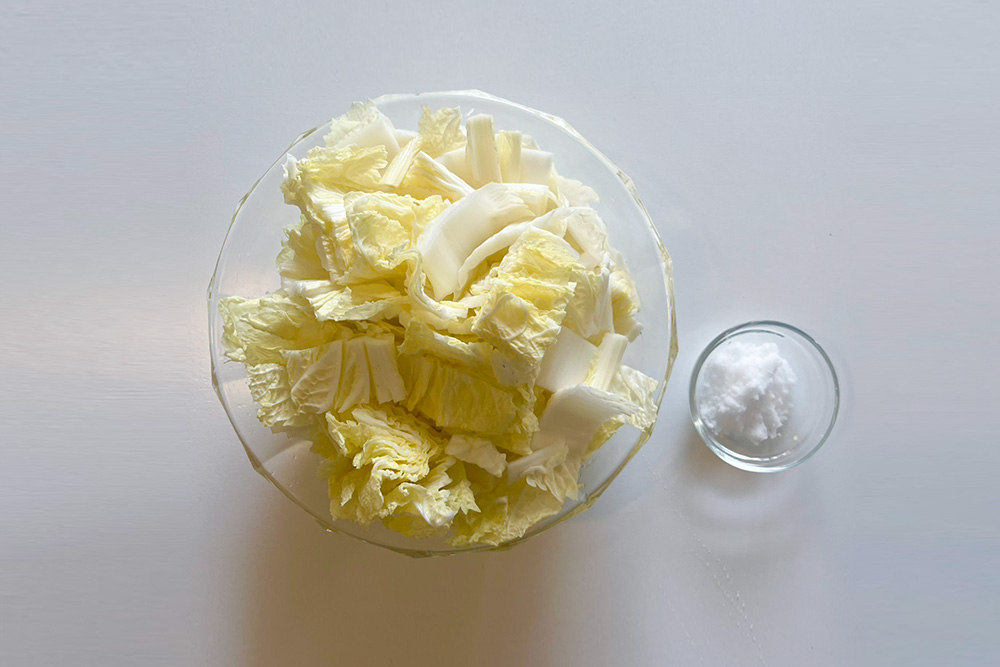 ❶ 白菜はざく切りにしてボウルに入れ、塩をまぶしてラップをかけ、重しをのせてしばらく置く。