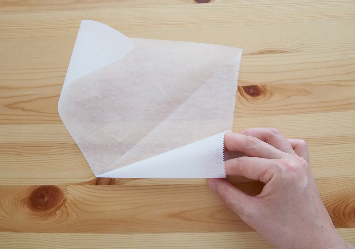 ❶ クッキングシートを三角になるよう半分に折り、ハサミで切る。