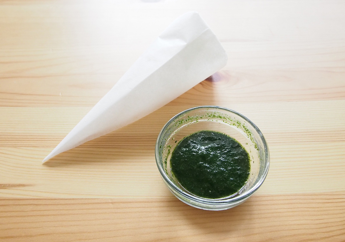 ❸ コルネのほうれん草ペーストを点々に絞る。