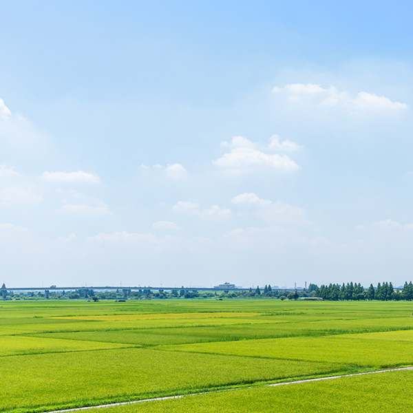住宅街から離れ、あたり一面の田園風景が広がっています。この辺りは馬宮地区と呼ばれ、早場米を中心に昔から味の良いお米が取れると言われてきた地域です。昔は近くを流れる荒川がよく氾濫していた地域で、土質もよく肥えていると言います。